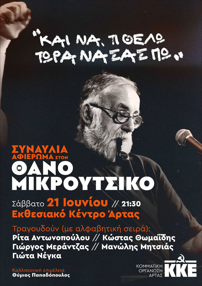 Η Κομματική Οργάνωση Άρτας του ΚΚΕ τιμά τον μεγάλο συνθέτη, τον μουσικό Θάνο Μικρούτσικο, μαζί με την οικογένειά του, με μια μεγάλη συναυλία το Σάββατο 21 Ιούνη, στις 9.30 μ.μ. Εκθεσιακό Κέντρο Άρτας.