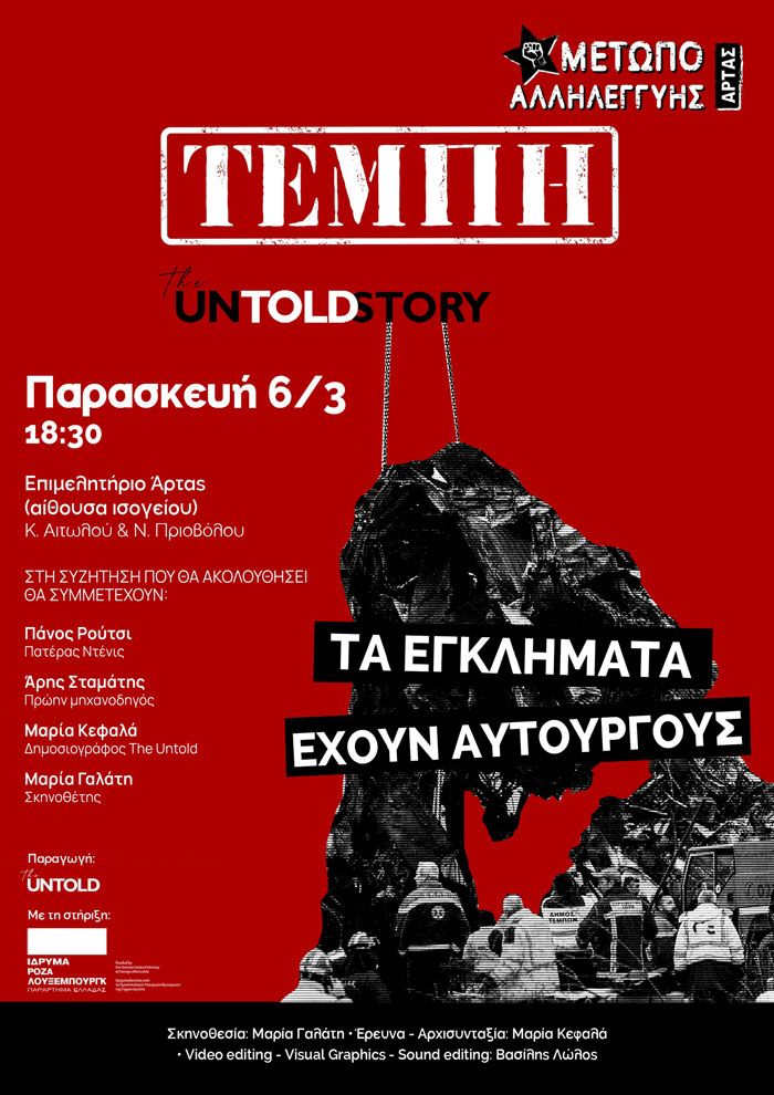 Την Παρασκευή 6 Μαρτίου 2026, στις 6:30 το απόγεμα στο Επιμελητήριο Άρτας, διοργανώνουμε εκδήλωση συζήτηση και προβολή του ντοκιμαντέρ ΤΕΜΠΗ: TheUnTOLDStories με ομιλητές τους: