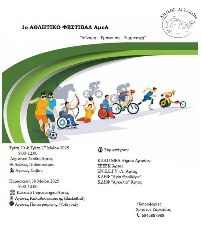 Ο Δήμος Αρταίων, το ΚΔΑΠ ΜΕΑ Δήμου Αρταίων, το ΕΕΕΕΚ Άρτας, το ΕΝ.Ε.Ε.ΓΥ.-Λ. Άρτας, το ΚΔΗΦ «Αγία Θεοδώρα» και το ΚΔΗΦ «Αγκαλιά» Άρτας, ενώνουν τις δυνάμεις τους και με ιδιαίτερη χαρά συνδιοργανώνουν το 1ο ΑΘΛΗΤΙΚΟ ΦΕΣΤΙΒΑΛ ΑμεΑ, με τίτλο «Δύναμη – Έμπνευση – Συμμετοχή».