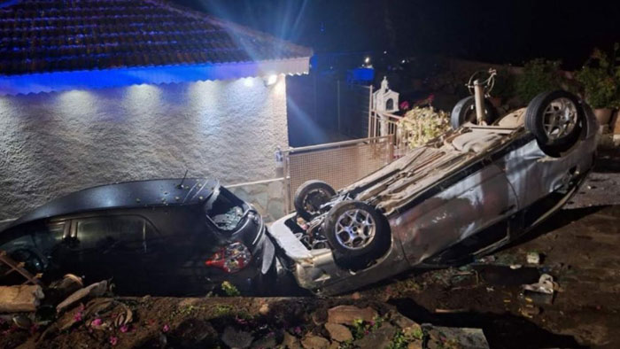 Από τη σφοδρή πρόσκρουση το όχημα που προσγειώθηκε ανάποδα μπροστά από το σπίτι φαίνεται να προκάλεσε ζημιές και σε σταθμευμένο όχημα.