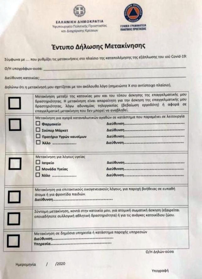 Εκτός από το SMS που θα στέλνουν οι πολίτες στις αρχές για να μετακινηθούν, θα μπορούν να εκτυπώσουν και μια φόρμα της γγ Πολιτικής Προστασίας με την οποία θα δηλώνουν για ποιον λόγο βρίσκονται εκτός της οικίας τους.