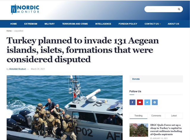 Στην αποκάλυψη πως η Τουρκία είχε εκπονήσει σχέδιο εισβολής και κατάληψης σε 131 νησίδες και βραχονησίδες στην Ελλάδα προέβη το Σάββατο η σκανδιναβική ιστοσελίδα, Nordic Monitor, της οποίας ηγείται ο Τούρκος αυτοεξόριστος δημοσιογράφος Αμπντουλάχ Μποζκούρτ. Σύμφωνα με το ρεπορτάζ, η Τουρκία σχεδίαζε να εισβάλει σε 131 νησίδες και βραχονησίδες στο Αιγαίο τις οποίες θέτει υπό αμφισβήτηση. Ο Μποζκούρτ που είναι εδώ και χρόνια σε κόντρα με τον Ρετζέπ Ταγίπ Ερντογάν, επικαλείται απόρρητο έγγραφο των τουρκικών ενόπλων δυνάμεων το οποίο αναφέρει πως ο τουρκικός στρατός έχει κατάλογο με 131 νησιά, νησίδες και βραχονησίδες στο Αιγαίο Πέλαγος, των οποίων το καθεστώς θεωρείται αμφισβητούμενο και είχε ετοιμάσει σχέδια για να τα καταλάβει σε περίπτωση σύγκρουσης με την Ελλάδα. Όπως αναφέρει, το έγγραφο βρέθηκε σε παραρτήματα φακέλου στη Σμύρνη και σύμφωνα με το ρεπορτάζ ο εισαγγελέας Οκάν Μπάτο φαίνεται να έχει ενσωματώσει το μυστικό σχέδιο στο αρχείο με διάφορα αποδεικτικά στοιχεία και το έχει κρύψει σε ασφαλές μέρος στο δικαστικό μέγαρο της Σμύρνης προσθέτοντας ότι «τέτοια έγγραφα μπορούν να εξεταστούν μόνο κεκλεισμένων των θυρών στο δικαστήριο με εντολή της δικαιοσύνης».