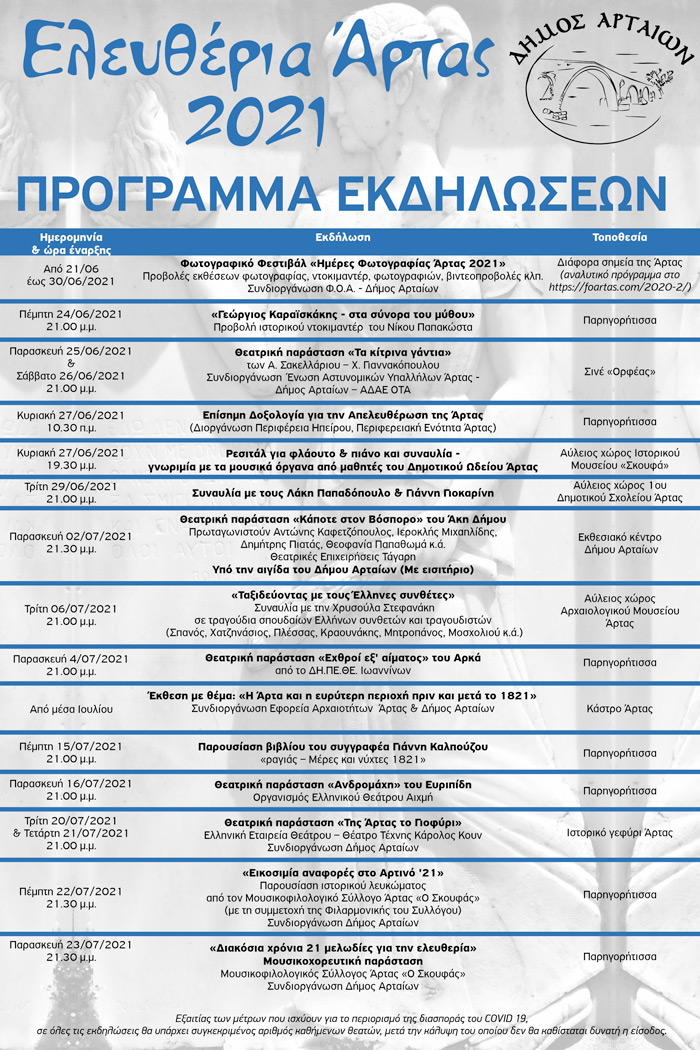 Η αρχή γίνεται στις 21 Ιουνίου με το Φωτογραφικό Φεστιβάλ «Ημέρες Φωτογραφίας Άρτας 2021», με προβολές και εκθέσεις σε διάφορα σημεία ης Άρτας, μια συνδιοργάνωση της Φωτογραφικής Ομάδας Άρτας (Φ.Ο.Α) και του Δήμου Αρταίων, η οποία θα διαρκέσει έως και τις 30 Ιουνίου. Την Πέμπτη 24 Ιουνίου στον προαύλιο χώρο της Παρηγορήτριας θα πραγματοποιηθεί η προβολή του ιστορικού ντοκιμαντέρ του Νίκου Παπακώστα, με τίτλο «Γεώργιος Καραϊσκάκης – Στα σύνορα του μύθου». Στο προλογικό του σημείωμα ο ποιητής, συνθέτης και σκηνοθέτης σημειώνει πως «Το ντοκιμαντέρ αυτό είναι η πραγματικά πρώτη στην ιστορία κινηματογραφική αναφορά – καταγραφή της ζωής, του χαρακτήρα και της δράσης του Αρχιστράτηγου της Ελληνικής Επανάστασης του 1821».