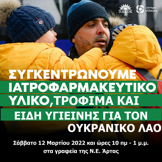 Η Νομαρχιακή Επιτροπή Άρτας ευχαριστεί προκαταβολικά όλους όσους θα συμβάλουν στην πραγματοποίηση της δράσης αλληλεγγύης του ΠΑΣΟΚ – Κινήματος Αλλαγής για τον Ουκρανικό λαό.