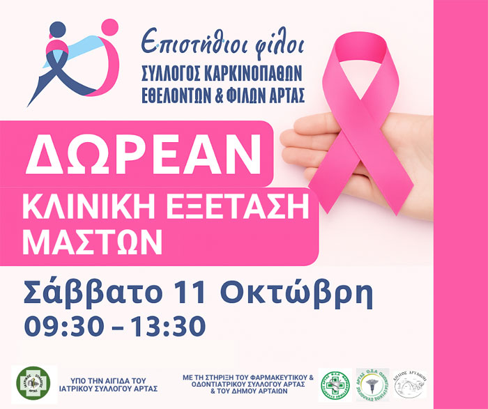 Ο Οκτώβρης «ντύνεται στα ροζ» και οι Επιστήθιοι Φίλοι – Σύλλογος Καρκινοπαθών, Εθελοντών και Φίλων Άρτας ξεκινούν τις φετινές δράσεις πρόληψης με μια δωρεάν κλινική εξέταση μαστών για όλες τις γυναίκες.
