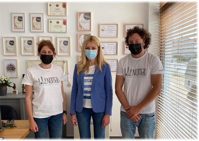 Στη συνέχεια, η Υφυπουργός επισκέφθηκε την επιχείρηση «Nomad Honey», μια καθετοποιημένη μεταποιητική μονάδα παραγωγής μελιού, που συνδυάζει την παραδοσιακή νομαδική μελισσοκομία με τη δημιουργικότητα, την καινοτομία και την υψηλή ποιότητα. Ξεναγήθηκε στο σύγχρονο εργαστήριο, που συσκευάζει αγνό, ακατέργαστο μέλι συγκεκριμένης γεωγραφικής ένδειξης σε διαφορετικές γεύσεις και συνθέσεις και παράγει ένα καινοτόμο προϊόν, το πρώτο ελληνικό ενεργειακό «τζελάκι», όπως ονομάζεται στον χώρο του αθλητισμού, από 100% φυσικό μέλι, γύρη και αλάτι.
