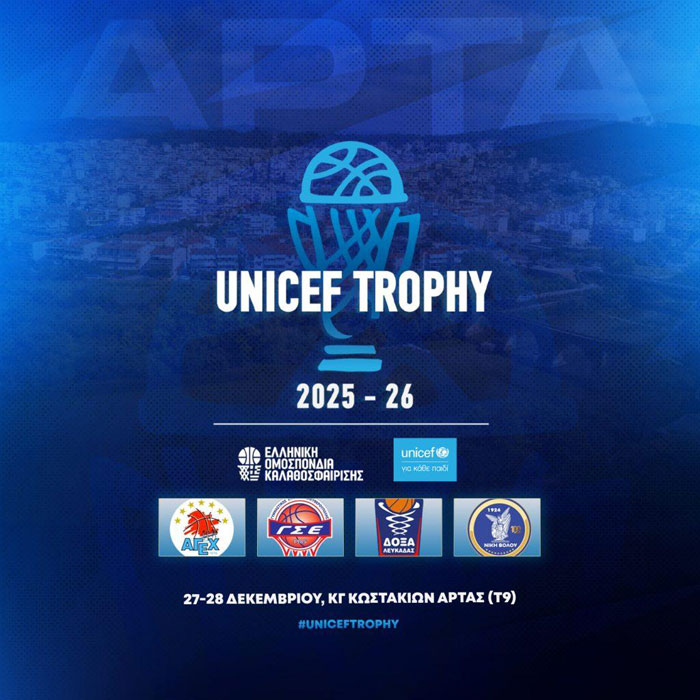 Το UNICEF Trophy επανέρχεται για τέταρτη σεζόν, σε μια σημαντική πανελλήνια μπασκετικήδιοργάνωση που έχει πλέον εξελιχθεί σε θεσμό, με τους τέσσερις διεκδικητές του τροπαίου (Νίκη Βόλου, ΑΓΕΧ, Ελευθερούπολη, Δόξα Λευκάδας), να δίνουν ραντεβού στην Άρτα και το Κλειστο Τ9 Κωστακίων το διήμερο 27-28 Δεκεμβρίου 2025.