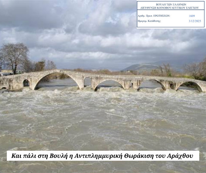 Το ζήτημα της αντιπλημμυρικής θωράκισης της Άρτας επανέρχεται δυναμικά στο προσκήνιο της Βουλής. Με δική μου πρωτοβουλία και μετά από επικοινωνία με τον βουλευτή Δράμας του ΠΑΣΟΚ – Κίνημα Αλλαγής, Αναστάσιο Νικολαΐδη, κατατέθηκε επίσημο κοινοβουλευτικό ερώτημα προς τον Υπουργό Μεταφορών και Υποδομών (με αριθμό πρωτοκόλλου 1609/03-12-2025) σχετικά με τις αδικαιολόγητες καθυστερήσεις στην ολοκλήρωση της κρίσιμης μελέτης για την προστασία της Άρτας και του Αράχθου.