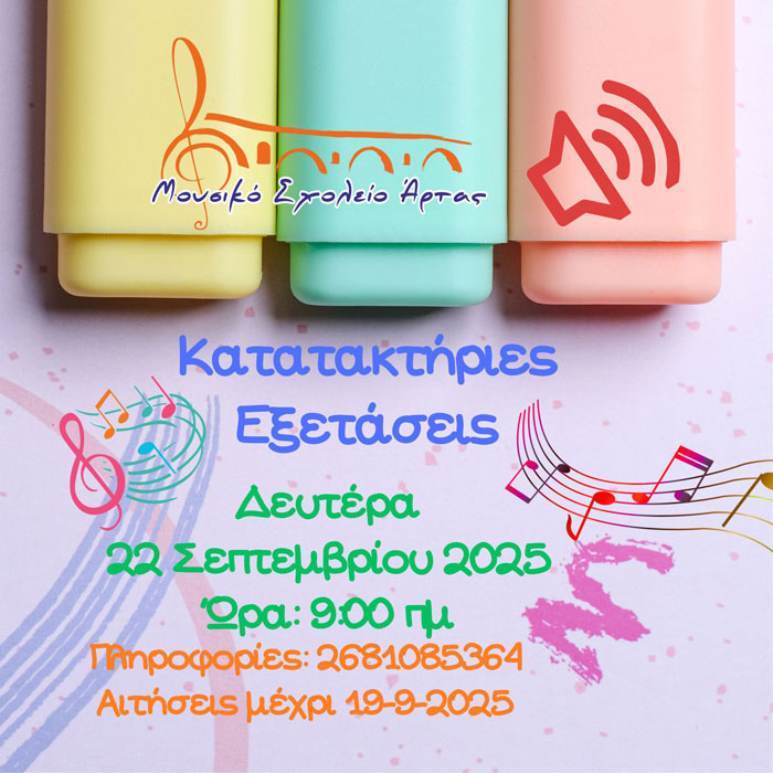 Το Μουσικό Σχολείο Άρτας γνωστοποιεί ότι προκηρύσσει κατατακτήριες εξετάσεις για την πλήρωση κενών θέσεων μαθητών/τριών, στην τάξη Β΄ Γυμνασίου, καθώς και στις τάξεις Α΄, B΄, Γ΄ Λυκείου, του σχολικού έτους 2025 – 2026.