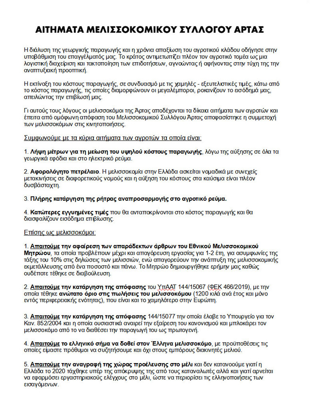Τα αιτήματα των μελισσοκόμων είναι τα εξής: