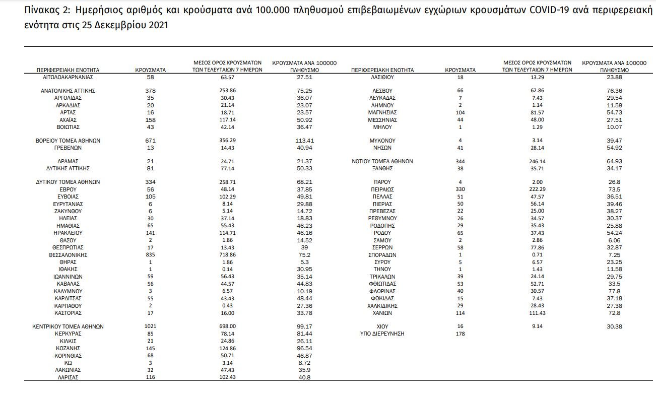 Τα νέα κρούσματα κορονοϊού σήμερα Σάββατο 25 Δεκεμβρίου ανακοίνωσε ο ΕΟΔΥ. Σύμφωνα με την ενημέρωση, κατά το τελευταίο 24ωρο στην Ελλάδα καταγράφονται 58 νέοι θάνατοι ενώ στις ΜΕΘ της χώρας νοσηλεύονται 617 διασωληνωμένοι ασθενείς. Καταγράφονται συνολικά 6.590 νέα κρούσματα.