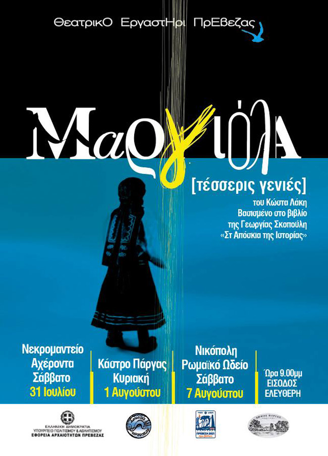 Το Θεατρικό Εργαστήρι Πρέβεζας σε συνεργασία με τον Δήμο Πρέβεζας, την Εφορεία Αρχαιοτήτων Πρέβεζας, την Πρέβεζα 2021 και τον Δήμο Πάργας παρουσιάζει την παράσταση :