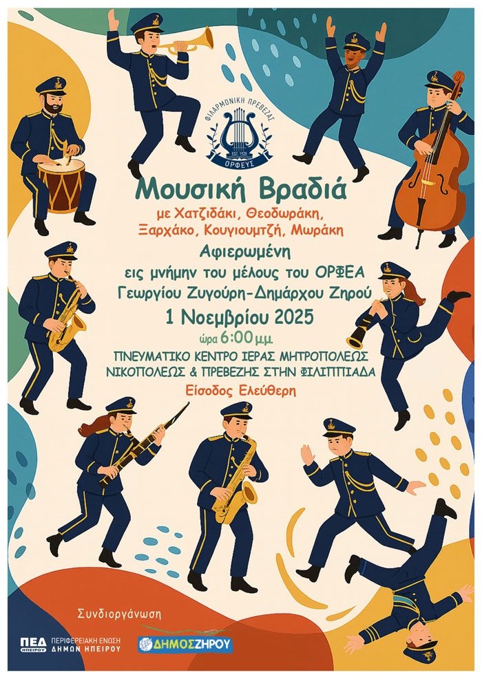 Η Φιλαρμονική Πρέβεζας «Ο Ορφεύς», σας προσκαλεί σε μουσική βραδιά με Χατζηδάκι, Θεοδωράκη, Ξαρχάκο, Κουγιουμτζή, Μωράκη, αφιερωμένη στον τέως Δήμαρχο Ζηρού και πρώην μέλος αυτής, Γεώργιο Ζυγούρη, που θα πραγματοποιηθεί το Σάββατο 1 Νοεμβρίου 2025 και ώρα 18:00, στο Πνευματικό Κέντρο Ιεράς Μητροπόλεως Νικοπόλεως και Πρεβέζης στη Φιλιππιάδα. Η εκδήλωση τελεί υπό την αιγίδα του Δήμου Ζηρού και της Περιφερειακής Ένωσης Δήμων Ηπείρου (ΠΕΔ).