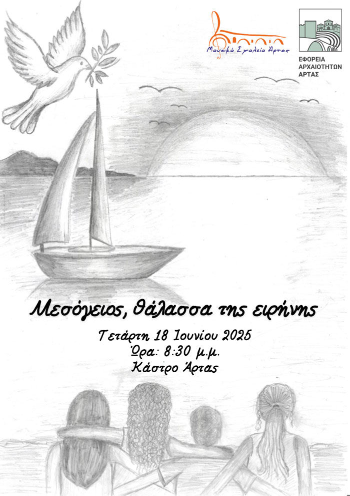 Το Μουσικό Σχολείο Άρτας σε συνεργασία με την Εφορεία Αρχαιοτήτων Άρτας, διοργανώνει συναυλία – αφιέρωμα με τίτλο: «Μεσόγειος, θάλασσα της ειρήνης» η οποία θα πραγματοποιηθεί την Τετάρτη 18 Ιουνίου 2025 μέσα στο Κάστρο της πόλης (πρώην γήπεδα τένις). Θα ακουστούν τραγούδια και οργανικά κομμάτια από μουσικές παραδόσεις χωρών της Μεσογείου, διανθισμένα με κείμενα και ποιήματα. Σκοπός της δράσης είναι μέσω της μουσικής και του λόγου να παρουσιάσουμε τις συγγένειες των λαών της Μεσογείου, να μιλήσουμε γι’ αυτά που μας ενώνουν, αναδεικνύοντας τη Μεσόγειο ως θάλασσα της ειρήνης και της συνεργασίας.