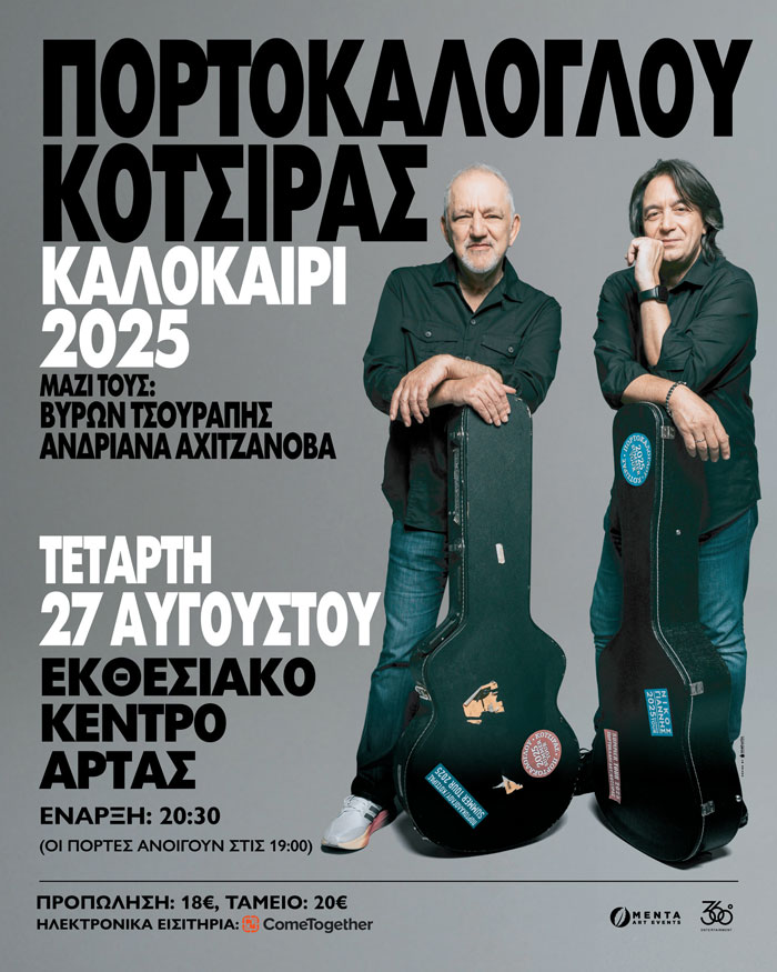 Το φετινό καλοκαίρι, δύο από τους σημαντικότερους και πιο αγαπημένους καλλιτέχνες της ελληνικής μουσικής σκηνής, ο Νίκος Πορτοκάλογλου και ο Γιάννης Κότσιρας, συναντιούνται για πρώτη φορά επί σκηνής και έρχονται στην Άρτα την Τετάρτη 27 Αυγούστου 2025, σε μια βραδιά που υπόσχονται να μείνει αξέχαστη.