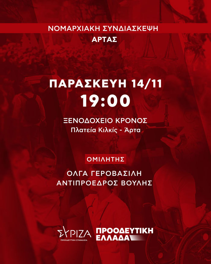 Η ΝΕ ΣΥΡΙΖΑ–ΠΣ Άρτας προσκαλεί τα μέλη του κόμματος στη Νομαρχιακή Συνδιάσκεψη την Παρασκευή 14 Νοεμβρίου στις 7 μ.μ. στο Ξενοδοχείο Κρόνος, πλατεία Κιλκίς, Άρτα, με εισηγήτρια την Όλγα Γεροβασίλη, βουλευτή Άρτας και Αντιπρόεδρο της Βουλής των Ελλήνων.