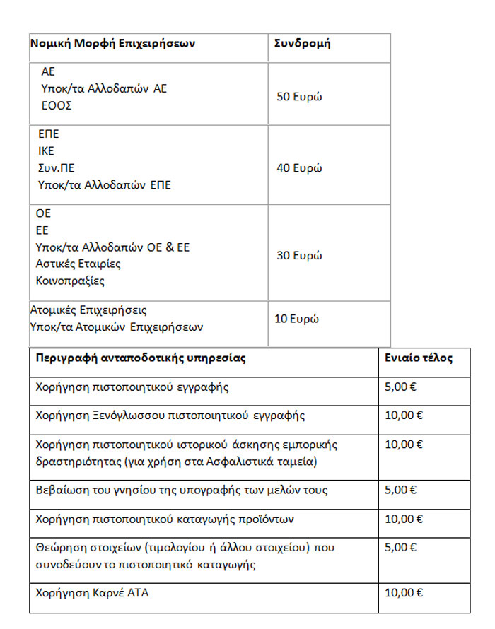 Ως εκ τούτου, οι συνδρομές και τα ποσά που αφορούν σε ανταποδοτικές υπηρεσίες του Επιμελητηρίου Άρτας προς τα μέλη του διαμορφώνονται ως εξής: