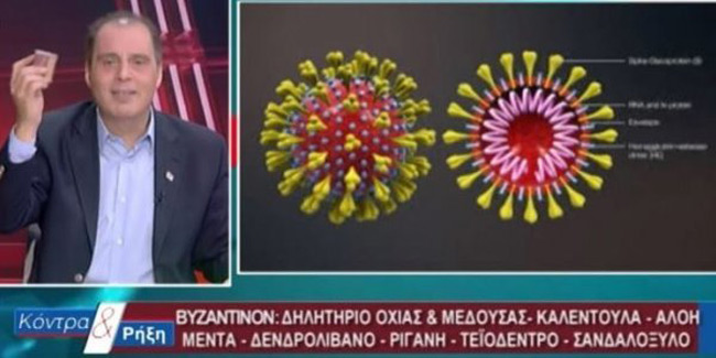 «Ο κορoνοϊός είναι ένα θέμα (στο βίντεο από το 31 λεπτό και μετά). Με την “Βυζαντινόν”, αποτρέπετε κάθε μικρόβια από τα χέρια σας. Είναι φυσικό, φόρμουλα με βότανα μέσα. Μία επάλειψη θα κάνετε το πρωί, μία το μεσημέρι και μία το βράδυ και θα είστε Ok. Μετά μπορείτε να κάνετε και 17 χειραψίες. Έχει μέσα ένα κοκτέιλ ουσιών. Και κάποια από τα βότανα υπάρχουν μόνο στην Αυστραλία. Ούτε να φοβάσαι τον κορωνοϊό. Ούτε τίποτα. Έχει από τα λίγα βότανα που είναι δυσεύρετα. Ούτε κορωνοϊό, ούτε να φοβάστε ιώσεις, ούτε βακτήρια ούτε να φοβάστε τίποτα. Πάρτε το και θα με θυμηθείτε…».