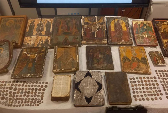 Πιο συγκεκριμένα βρέθηκαν και κατασχέθηκαν, μεταξύ άλλων, 264 νομίσματα, 14 θρησκευτικές εικόνες, 2 Ιερά Ευαγγέλια και θρησκευτικό βιβλίο του 18ου αιώνα, 2 κυνηγετικά όπλα, 262 κυνηγετικά φυσίγγια και 12.810 ευρώ.