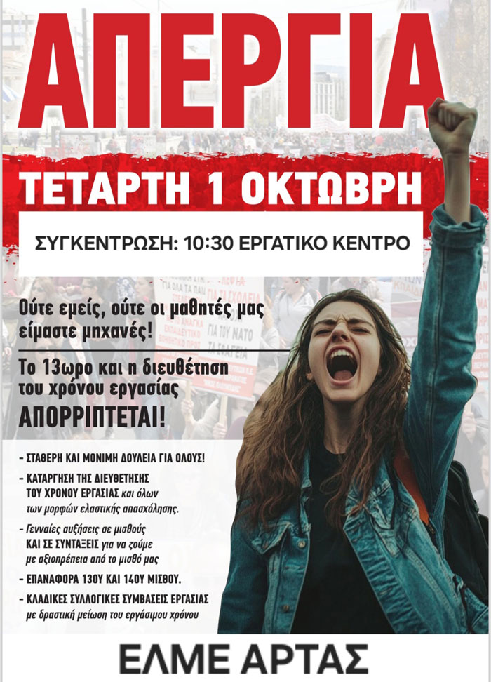 Την 1η Οκτωβρίου κλείνουμε όλα τα σχολεία. Κατεβαίνουμε όλοι και όλες στον δρόμο, για εμάς, για τις οικογένειές μας, για τους μαθητές μας. Υπερασπιζόμαστε τη ζωή και την αξιοπρέπειά μας! Στέλνουμε καθαρό μήνυμα: η πολιτική που μας γυρίζει στον μεσαίωνα, που μας καταδικάζει σε φτώχεια και εξάντληση, το νομοσχέδιο της κυβέρνησης για το 13ώρο, να πεταχτεί στα σκουπίδια.