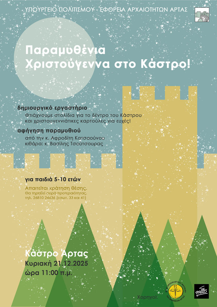 Η Εφορεία Αρχαιοτήτων Άρτας γιορτάζει τα Χριστούγεννα και προσκαλεί τους μικρούς φίλους, ηλικίας 5-10 ετών, να λάβουν μέρος σε εργαστήριο κατασκευής χριστουγεννιάτικων στολιδιών και ευχετήριων καρτών, εμπνευσμένων από την αρχιτεκτονική και την ιστορία του Κάστρου της Άρτας.