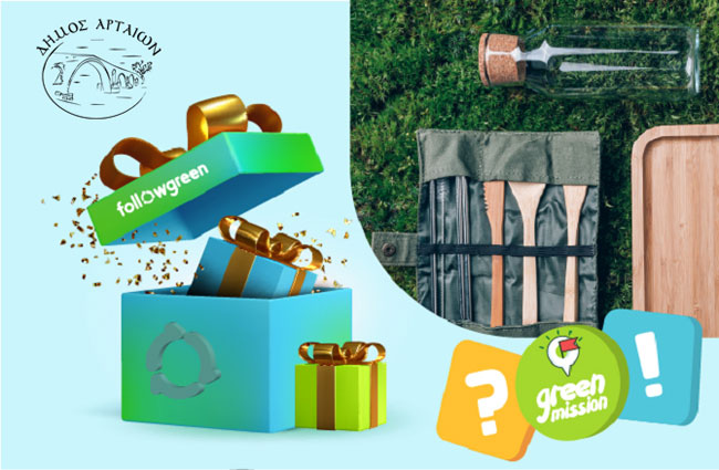 Ο Δήμος Αρταίων, προσφέρει στους δημότες την ευκαιρία να έρθουν πιο κοντά στον κόσμο ανακύκλωσης, μέσα από ολιγόλεπτες εκπαιδευτικές «Πράσινες Αποστολές – Green Missions». Ο χρήστης ολοκληρώνοντας τους απαιτούμενους στόχους, κερδίζει επιπλέον πόντους επιβράβευσης από το ενημερωτικό υλικό και παράλληλα αποκτά συμμετοχή σε κληρώσεις Followgreen για υπέροχα δώρα. Κάθε 10 ημέρες, μία νέα «Πράσινη Αποστολή» βρίσκεται στη διάθεση των δημοτών.