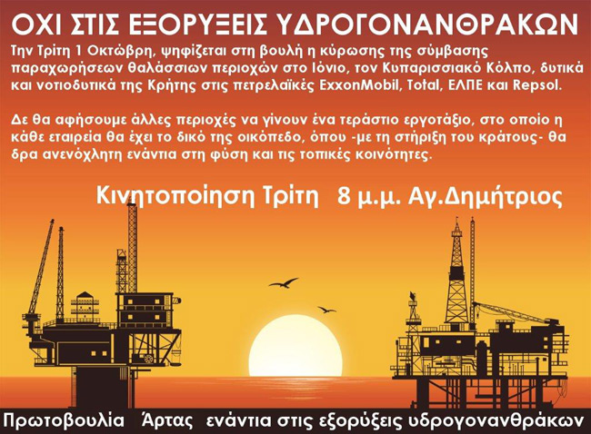 Η παραχώρηση στην πετρελαιοβιομηχανία του τόπου, της θάλασσας και της ζωής μας είναι καταστροφή!