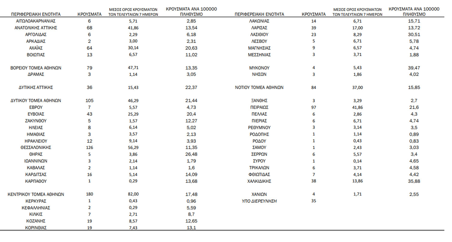 Σήμερα ανακοινώνουμε 1261 νέα κρούσματα της λοίμωξης του νέου κορωνοϊού (COVID-19), εκ των οποίων 18 εντοπίστηκαν κατόπιν ελέγχων στις πύλες εισόδου της χώρας. Ο συνολικός αριθμός των κρουσμάτων ανέρχεται στα 158716, εκ των οποίων 52.0% άνδρες. Κατά την ιχνηλάτιση βρέθηκε ότι 5988 (3.8%) θεωρούνται σχετιζόμενα με ταξίδι από το εξωτερικό και 49885 (63.9%) είναι σχετιζόμενα με ήδη γνωστό κρούσμα.
