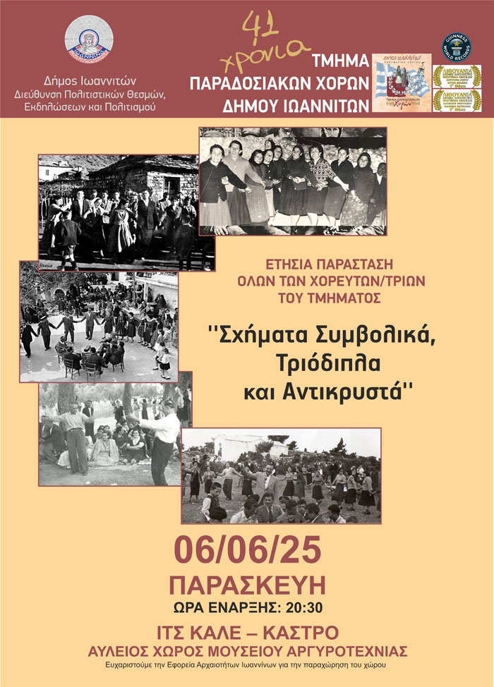 Το Τμήμα Παραδοσιακών Χορών του Δήμου Ιωαννιτών παρουσιάζει την Παρασκευή 6 Ιουνίου, στις 20:30, στον Αύλειο Χώρο του Μουσείου Αργυροτεχνίας, στην εσωτερική ακρόπολη Ιτς Καλέ του Κάστρου των Ιωαννίνων, την ετήσια παράστασή του με τη συμμετοχή όλων των χορευτών του Τμήματος.