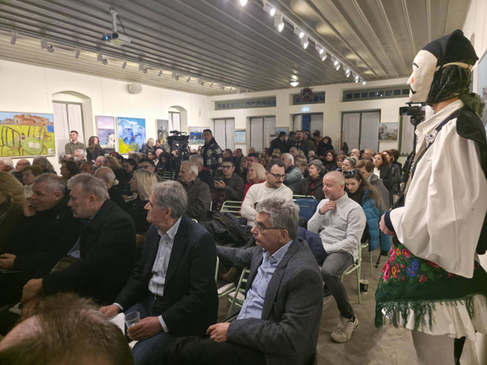 Παράλληλα, οι «πρωταγωνιστές» χορευτές του Γαϊτανακίου, με τις γνήσιες παραδοσιακές φορεσιές και τις χαρακτηριστικές προσωπίδες τους, έδωσαν ζωντανή υπόσταση στο έθιμο μέσα στην αίθουσα, μετατρέποντας την παρουσίαση σε βιωματική εμπειρία.