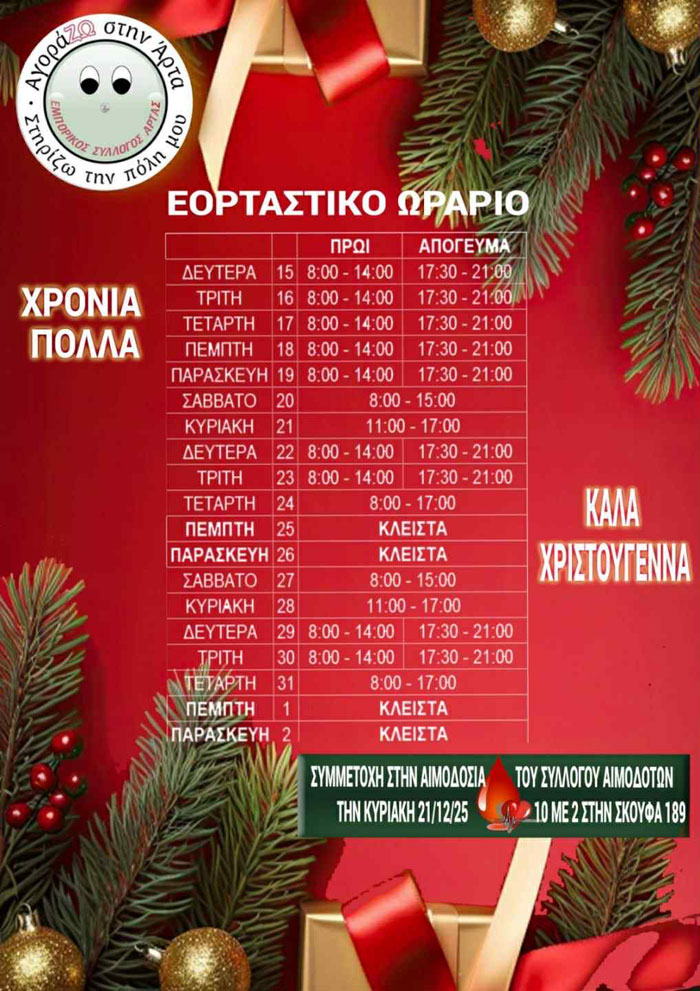 Το Επιμελητήριο Άρτας, σύμφωνα με την ανακοίνωση του Εμπορικού Συλλόγου Άρτας, ενημερώνει το καταναλωτικό κοινό για το εορταστικό ωράριο των εμπορικών καταστημάτων κατά τη διάρκεια των εορτών των Χριστουγέννων του 2025 και της Πρωτοχρονιάς μέχρι και τα Θεοφάνεια του 2026.