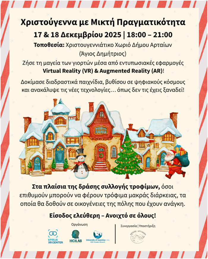 Το EpirusXRCenter& το IEEEStudentBranchUniversityofIoannina | Arta σε συνεργασία με τον Δήμο Αρταίων, προσκαλούν μικρούς και μεγάλους σε μια ξεχωριστή γιορτινή δράση στο Χριστουγεννιάτικο Χωριό του Δήμου Αρταίων στον Άγιο Δημήτριο.