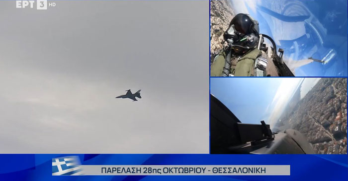 Μήνυμα για τον εορτασμό της εθνικής επετείου της 28ης Οκτωβρίου απηύθυνε από τον ασύρματο του F-16 ο επισμηναγός Γεώργιος Σωτηρίου στην στρατιωτική παρέλαση της Θεσσαλονίκης.