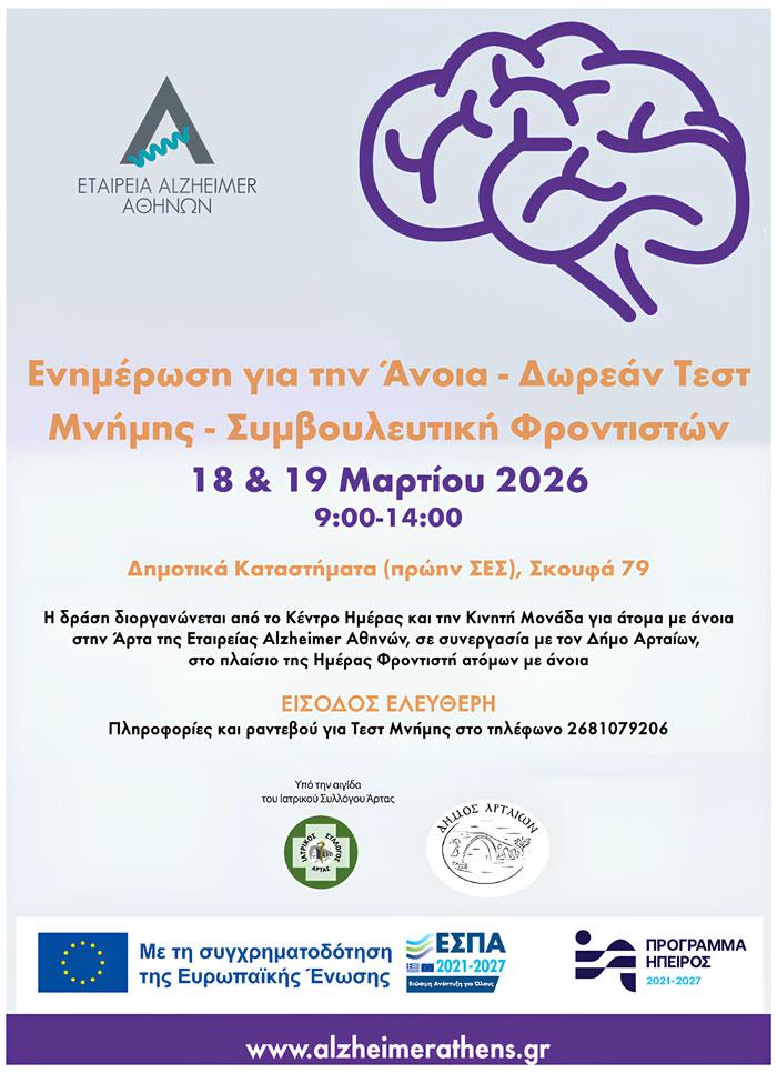 Στο πλαίσιο αυτό, το Κέντρο Ημέρας και η Κινητή Μονάδα για άτομα με άνοια στην Άρτα της Εταιρείας Alzheimer Αθηνών, οι δράσεις των οποίων πραγματοποιούνται με τη συγχρηματοδότηση της Ευρωπαϊκής Ένωσης μέσω του Επιχειρησιακού Προγράμματος «Ήπειρος» 2021–2027, διοργανώνει διήμερη δράση ενημέρωσης και πρόληψης με θέμα «Ενημέρωση για την Άνοια – Δωρεάν Τεστ Μνήμης & Συμβουλευτική Φροντιστών», η οποία θα πραγματοποιηθεί στις 18 και 19 Μαρτίου 2026, από 09:00 έως 14:00, στα Δημοτικά Καταστήματα (πρώην ΣΕΣ), Σκουφά 79, στην Άρτα.