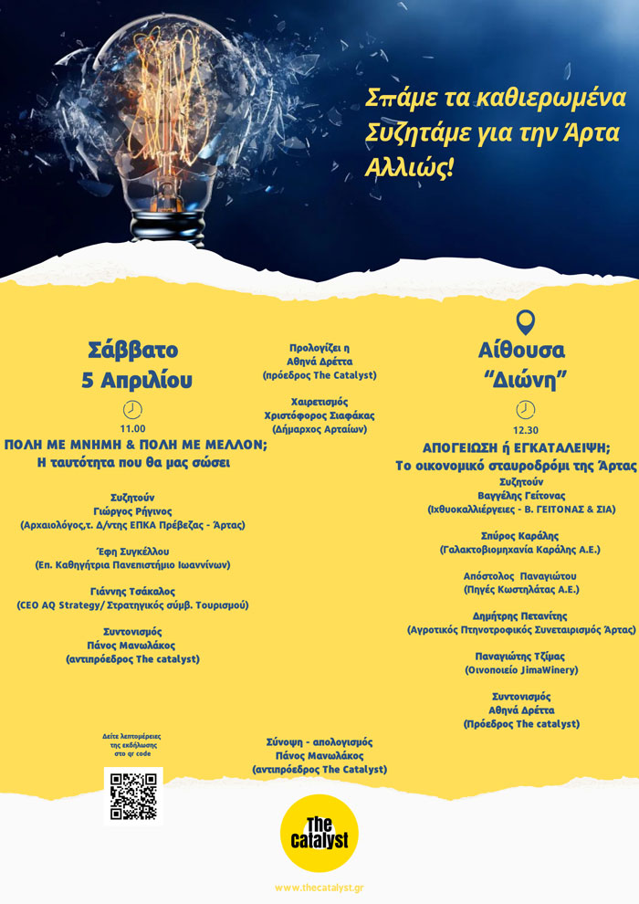 Ο όμιλος ιδεών “The Catalyst” διοργανώνει μια σημαντική εκδήλωση με τίτλο “Restart (?) Άρτα: Το Μέλλον Γράφεται Τώρα”, αφιερωμένη στο παρόν και το μέλλον της πόλης της Άρτας.