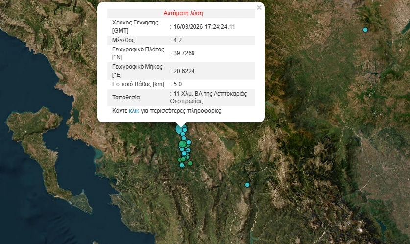 Το επίκεντρο εντοπίζεται περίπου 11 χιλιόμετρα βορειοανατολικά της Λεπτοκαρυάς Θεσπρωτίας, ενώ η δόνηση έγινε αισθητή σε αρκετές περιοχές της Ηπείρου, προκαλώντας στιγμιαία ανησυχία στους κατοίκους.