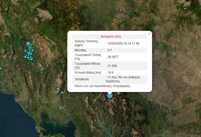Σεισμός έντασης 4,7 βαθμών της κλίμακας Ρίχτερ σημειώθηκε το μεσημέρι της Πέμπτης (12/3) στην Καρδίτσα.